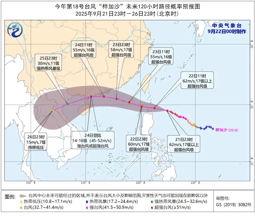 23日起“樺加沙”將自東向西嚴(yán)重影響廣東海面及陸地,需提前做好防范。預(yù)計,23-25日, 廣東有一次嚴(yán)重的風(fēng)雨影響過程。預(yù)計“樺加沙”將以每小時15-20公里的速度向西偏北方向移動,強度逐漸加強。22日將穿過巴士海峽,23日凌晨進(jìn)入南海東北部海面,以后趨向廣東沿海。