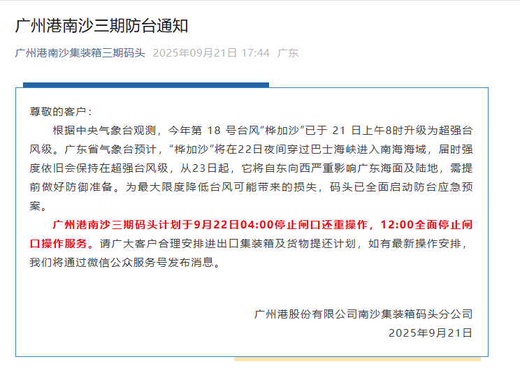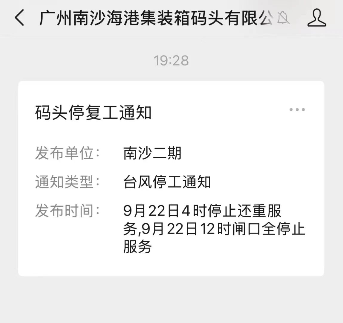 廣州港南沙二、三期碼頭計劃于9月22日04:00停止閘口還重操作,12:00全面停止閘口操作服務(wù)。YICT、SCT、CCT、MCT將于9月22日00時00分全面停止閘口操作服務(wù)。