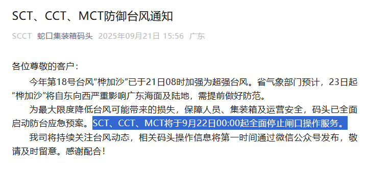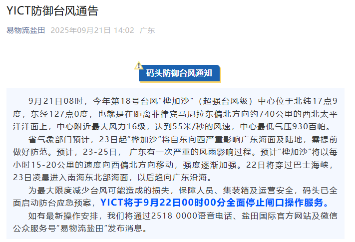 為最大限度減少臺風(fēng)可能造成的損失,保障人員、集裝箱及運營安全,碼頭已全面啟動防臺應(yīng)急預(yù)案,YICT、SCT、CCT、MCT將于9月22日00時00分全面停止閘口操作服務(wù)。