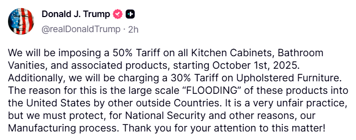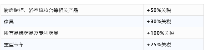 此次關(guān)稅調(diào)整涉及范圍廣泛。包括對廚房櫥柜、浴室洗手臺及相關(guān)建材征收50%關(guān)稅,進口家具征收30%關(guān)稅,專利及品牌藥品加征100%關(guān)稅,同時對所有進口重型卡車加征25%關(guān)稅。